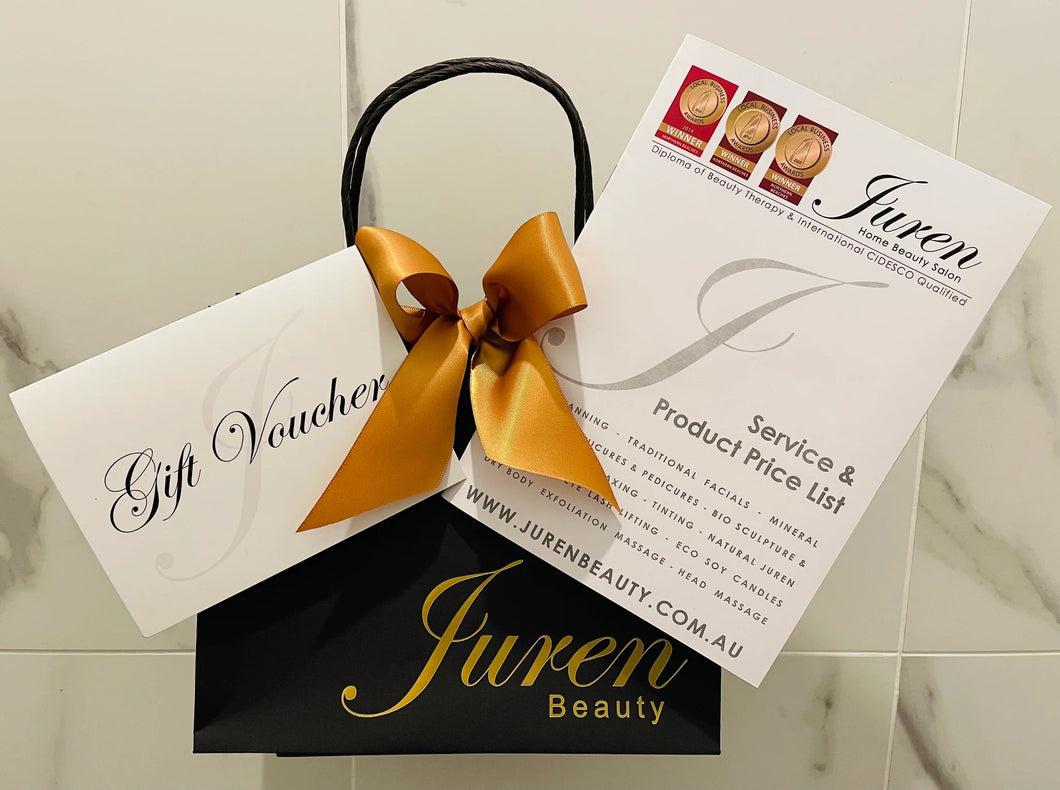 The Gift Voucher is presented in a Balck Bag with Bow along with a Juren Service List and Complimentary Gift.